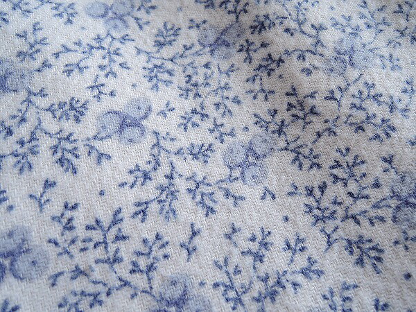 カラーはオフホワイト・ネイビー・ライトブルーパープルなどで、総柄で少し毛羽感のあるやや厚手素材です。