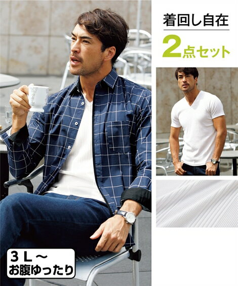 シャツ カジュアル メンズ 2点セット 2重衿配色切替 長袖 + 半袖 Tシャツ トップス 黒系+白/紺系+白/白系+黒 M/L/LL ニッセン