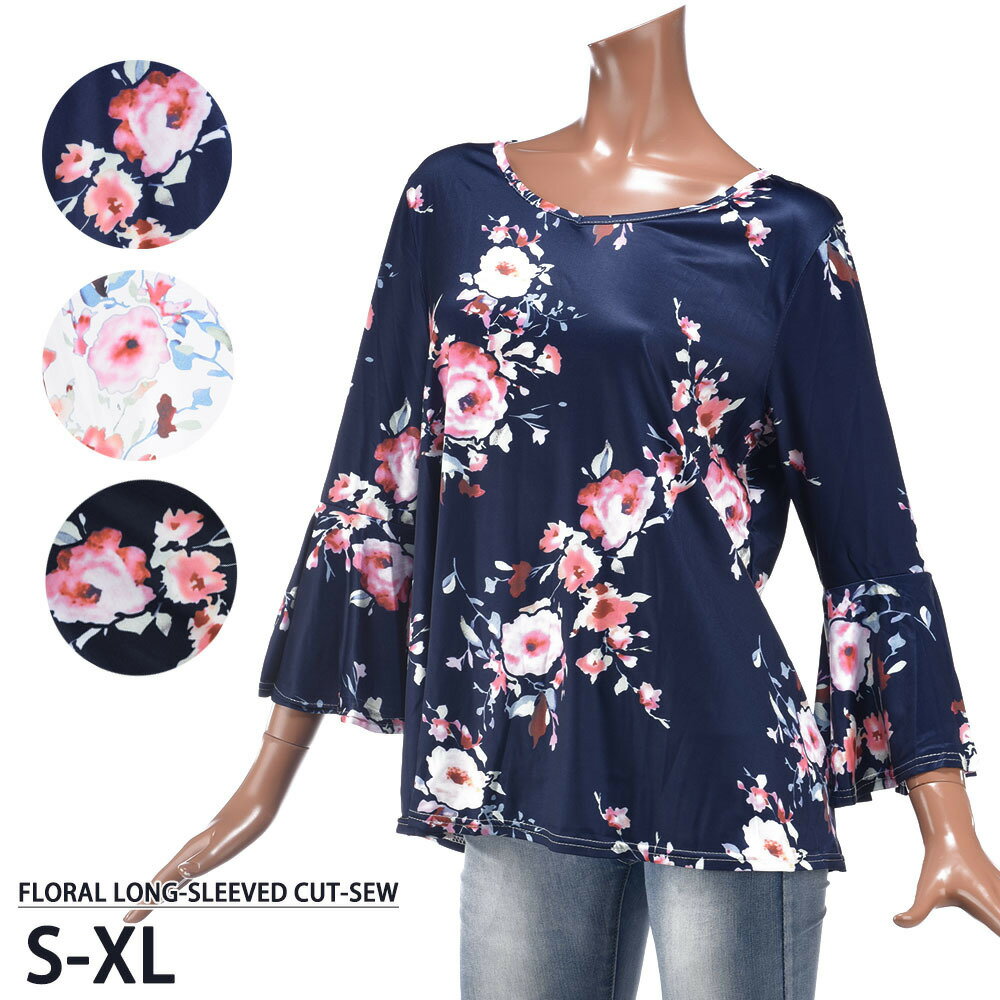 送料無料Tシャツ 長袖 Vネック ベルスリーブ レディース カットソー トップス フレア 花柄 フラワー 春 秋 おしゃれ 上品 きれいめ 可愛い かわいい 女性用 婦人用 S M L XL 黒 白 青